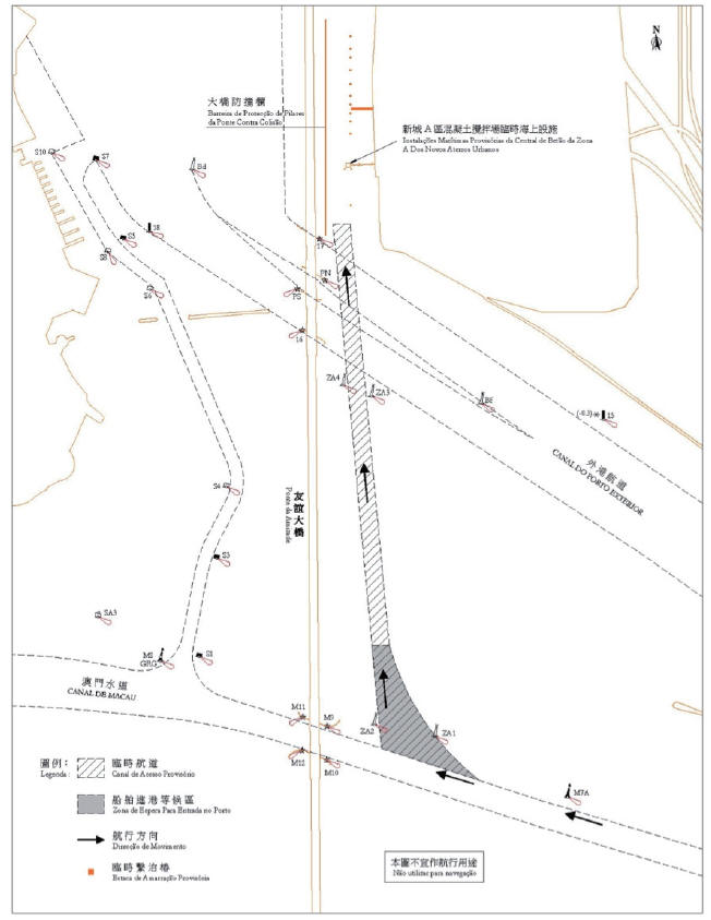 一、臨時航道位於友誼大橋東側,介乎新城A區西南端至澳門水道之間,橫跨外港航道及連接澳門水道;北界為外港航道17號燈樁之緯度圈,而南界為澳門水道右側。