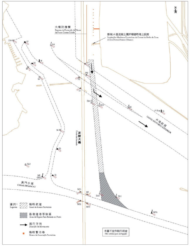 一、船舶必須按照附件一的示意圖所示的航行方向,經澳門水道進入臨時航道及外港航道,並以適當航向駛往與臨時航道相連接的港池、靠泊碼頭及海上設施。