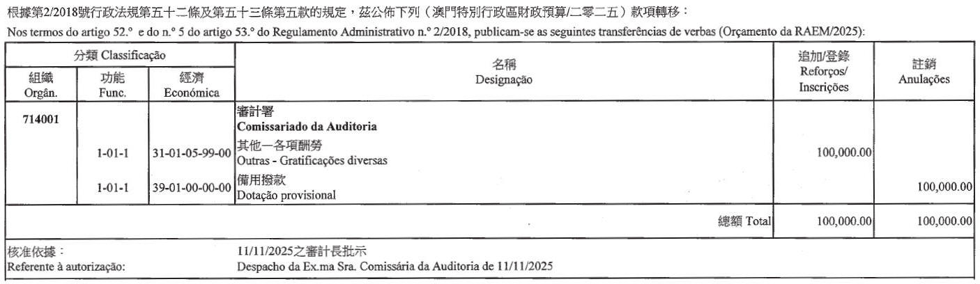 徐錦波—根據現行第15/2009號法律《領導及主管人員通則的基本規定》第五條及現行第26/2009號行政法規《領導及主管人員通則的補充規定》第八條的規定,因具備公民品德、適當經驗及專業能力履行職務,其擔任審計局高級審計師的定期委任,自二零二五年十二月三日起續期一年。