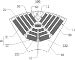 [57] Resumo : 本實用新型公開了一種電機的轉子、電機和車輛,包括:轉子鐵芯,轉子鐵芯設置有多個周向分佈的磁極,磁極包括多個沿轉子鐵芯徑向間隔的磁槽排,多個磁槽排包括第一磁槽排,第一磁槽排包括第一主磁槽和第一副磁槽,第一主磁槽分別位於第一副磁槽的相對兩側,第一副磁槽包括:第一槽段和第二槽段,第一槽段的長度方向和第二槽段的長度方向之間具有夾角α;多個磁鐵,至少一部分磁鐵分別設置於第一主磁槽、第一槽段和第二槽段內且彼此間隔設置。由此,可以為第一主磁槽的佈置提供更大的空間,如此,可以通過增大第一主磁槽的磁鐵厚度來增大其面積,這樣可以增強轉子內部的磁場強度,減少磁路中的磁阻,從而可以提高轉子的轉矩功率。