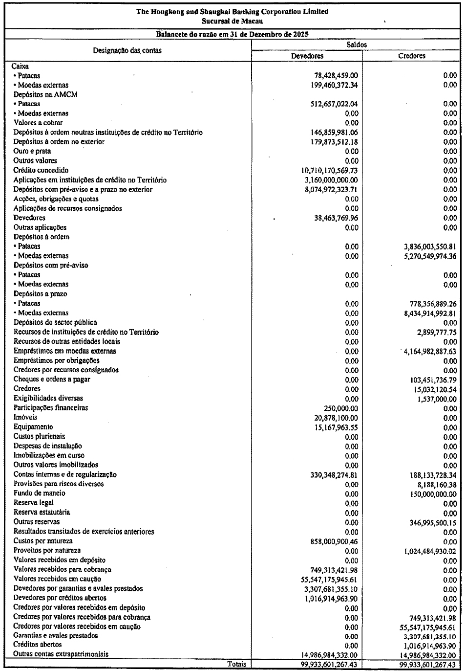Balancete do razão em 31 de Dezembro de 2025