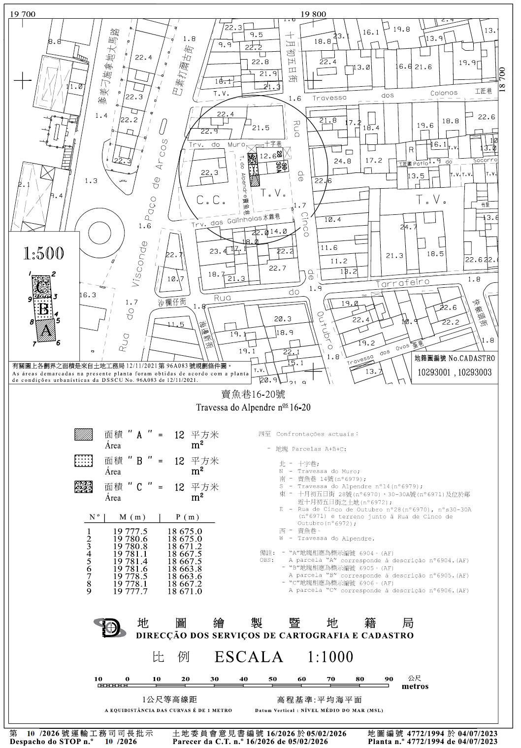 7. O terreno, objecto do contrato, com a área global de 36 m², encontra-se demarcado e assinalado com as letras «A», «B» e «C», respectivamente, com a área de cada um de 12 m², na planta n.º 4 772/1994, emitida em 4 de Julho de 2023, pela Direcção dos Serviços de Cartografia e Cadastro, doravante designada por DSCC.