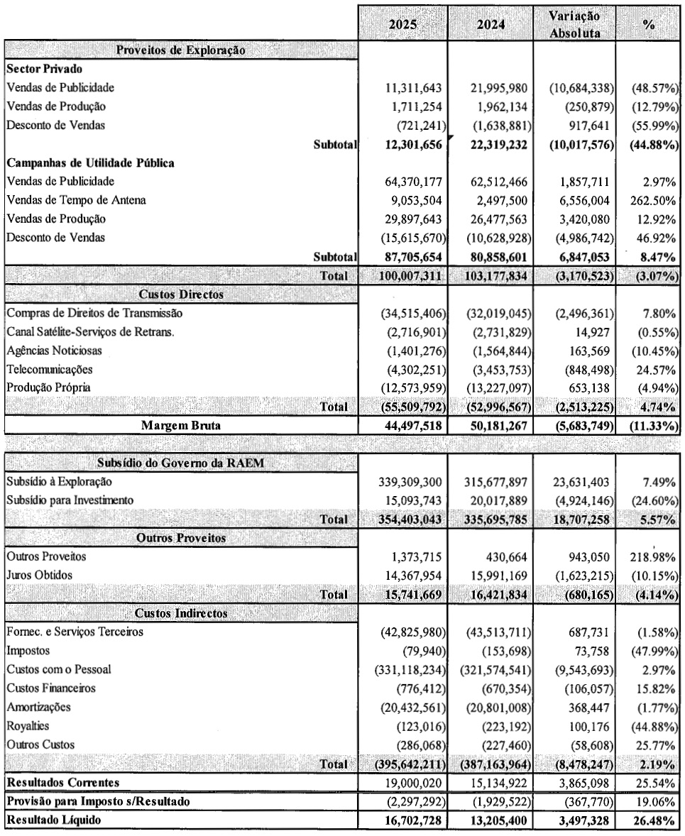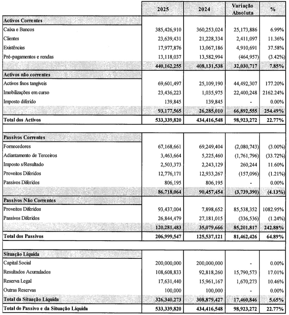 De acordo com o estabelecido nos estatutos sociais, esta Fiscal Única procedeu à análise e ao exame dos documentos financeiros e das contas da Sociedade referentes ao ano de 2025, além de se inteirar do respectivo regime e forma de funcionamento da Sociedade no ano ora em apreço. No entendimento desta Fiscal Única, os referidos documentos financeiros revelam, de forma adequada e conveniente, a classificação e natureza das contas, bem como a situação financeira da Sociedade, sendo esse entendimento corroborado pelo auditor externo no seu relatório, o qual comenta o facto dos documentos financeiros da Sociedade reflectirem, em todas as suas componentes principais e por forma justa, a situação financeira da Sociedade no exercício findo no dia 31 de Dezembro de 2025.