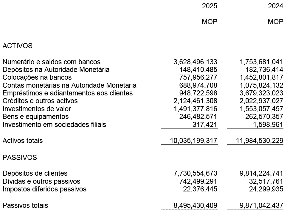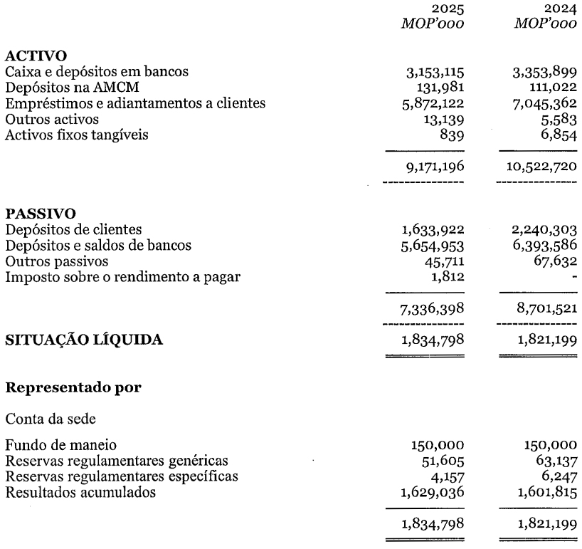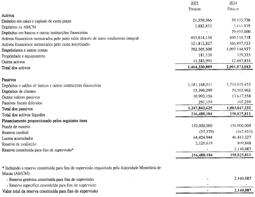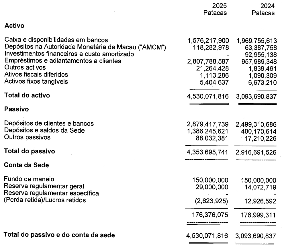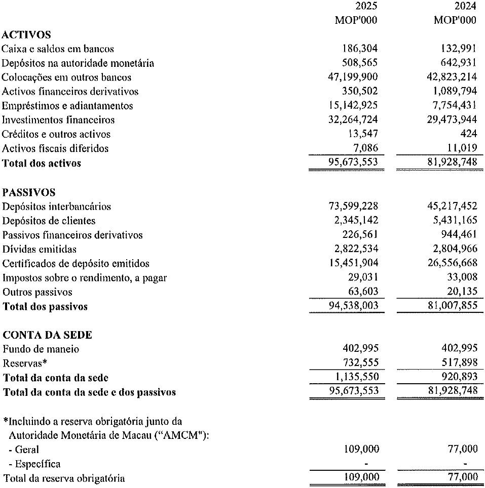 Em nossa opinião, as demonstrações financeiras resumidas extraídas das demonstrações financeiras auditada da Sucursal relativas ao exercício findo em 31 de Dezembro de 2025 são consistentes, em todos os aspectos materiais, com essas demonstrações financeiras, de acordo com 1) do artigo 86.º do Regime Jurídico do Sistema Financeiro do território de Macau, aprovado pela Lei n.º 13/2023.