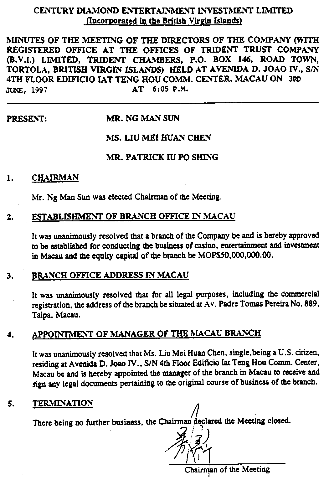 A sociedade tem a sua sede social em Macau, no prédio sito na Avenida da Praia Grande, n.º 493, edifício Hang Cheong, 12.º andar, «E», a qual poderá ser transferida para outro local por deliberação dos sócios.