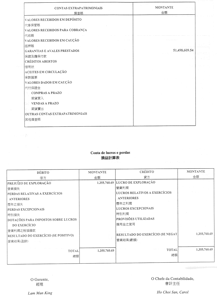 São, desde já, nomeados gerente-geral o sócio Ho, King Fung, e gerente o sócio Cheong Mui San.