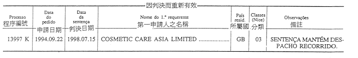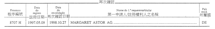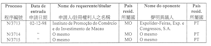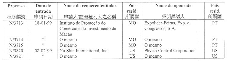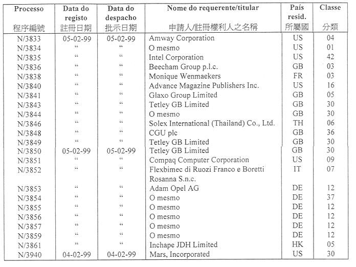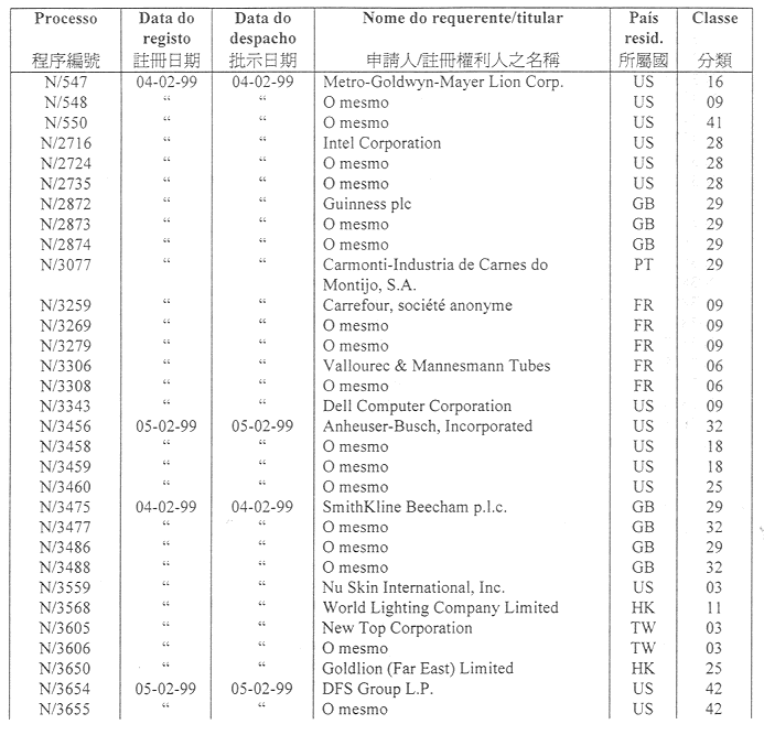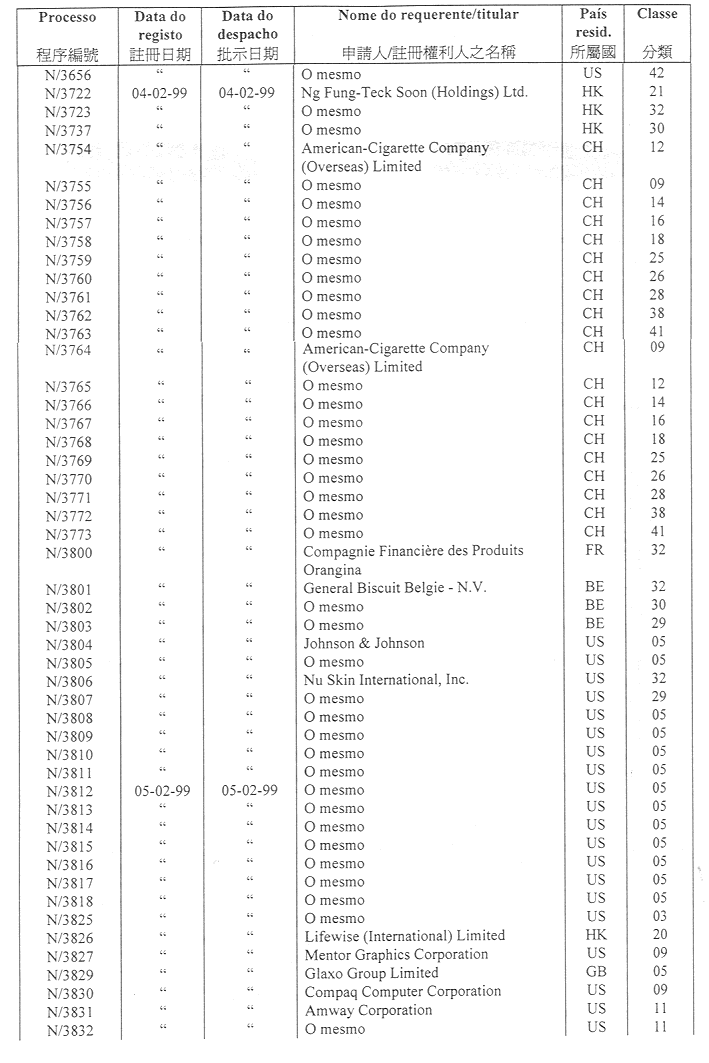 根據十一月六日第56/95/M號法令第十六條及第三十三條,以下公布澳門商標註冊之請求書,並按照相同法規第三十條及第三十四條,由通告公布日期開始計算三十日期限內,得提出產品及服務分類之聲明異議,及任何人認為倘給予註冊將對其造成損害得由通告公布日期開始計算九十日期限內提出聲明異議。