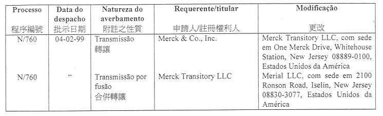 申請人:Merck & Co. Inc., One Merck Drive, P.O. Box 100, Whitehouse Station, New Jersey, Estados Unidos da América.