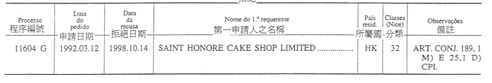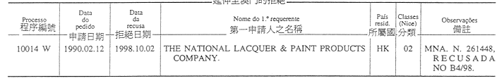 商標編號10 014-M—因註冊請求被拒絕,故在獲批給表內及更正表內之刊登應視作無效,註冊請求被拒絕之批示並刊登於本期政府公報內。