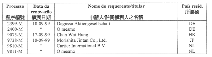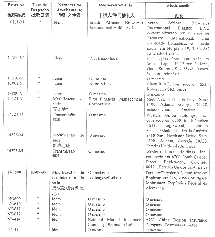根據公佈於一九九五年九月四日第三十六期第一組《澳門政府公報》內之一月二十四日第16/95號法令第二百九十二條第二款,以下公佈批給、拒絕、續展、再次確認、失效、附註、放棄及不獲批准之申請之名單: