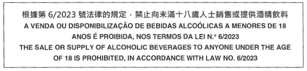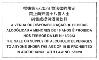 | 中文 | 根據第6/2023號法律的規定,禁止向未滿十八歲人士銷售或提供酒精飲料 |