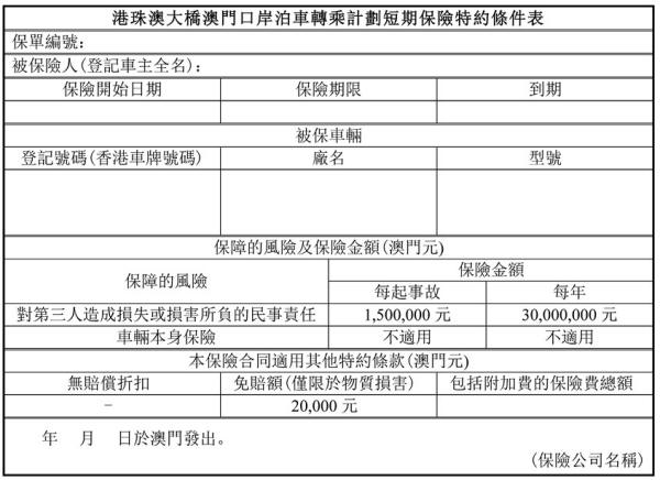 1.1 本短期保險所載的規定僅適用於港珠澳大橋珠澳口岸人工島指定範圍內使用並符合第5條所定車輛類別的香港車輛。