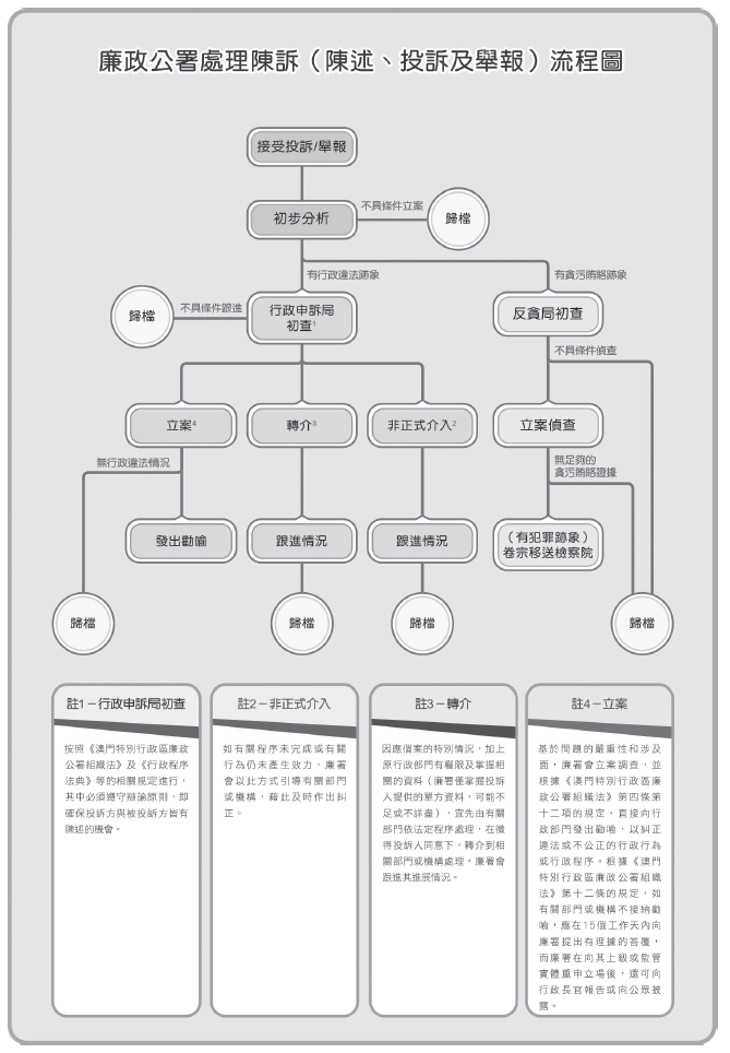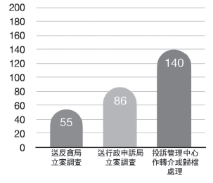 此外,市民除了可親身到兩個社區辦事處進行即時、預約投訴或舉報之外,自2022年3月開始,廉政公署推出了網上預約平台,市民可透過該平台進行投訴預約,免卻輪候問題。經統計,使用該平台服務到兩個社區辦事處進行投訴查詢的共51宗,其中黑沙環社區辦事處有27宗,氹仔社區辦事處有24宗。