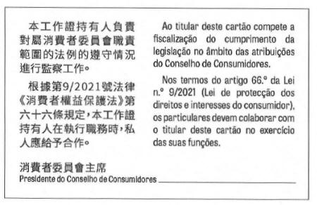 2. O cartão de identificação referido no número anterior é de cores branca e verde, com dimensões de 85 mm x 54 mm, tendo no canto superior esquerdo o emblema regional da Região Administrativa Especial de Macau.